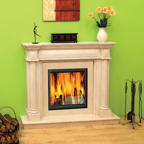 Портал из натурального мрамора Crema Marfil или Galala Beige. Размеры основания (ВхШхГ): 1300х1550х350. Максимальные внутренние размеры под топку: 850х900 мм.