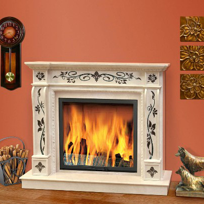 Портал из натурального мрамора Crema Marfil, Emperador Dark и Verde. С высокохудожественной инкрустацией из мрамора. Размеры основания (ВхШхГ): 1320х1600х400. Максимальные внутренние размеры под топку: 950х880 мм.