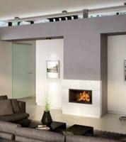Полувстроенный камин в стиле модерн. Лаконичный камин с минимумом декоративных деталей украшает строгое сочетание цветов: серого и белого. Камин облицован шлифованным камнем известковой породы.